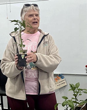 Sue Anderson, a master gardener, guides students to plant veggies during a class session using new planters built by the Rotarians.